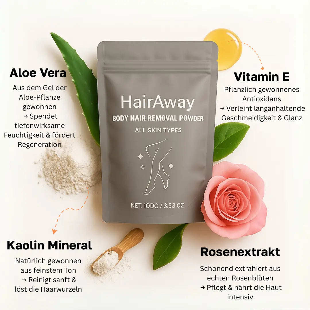 HairAway kombiniert eine natürliche Haarentfernung mit pflegender Wirkung. Das Pulver ist besonders sanft und dennoch hochwirksam – selbst an empfindlichen Stellen.